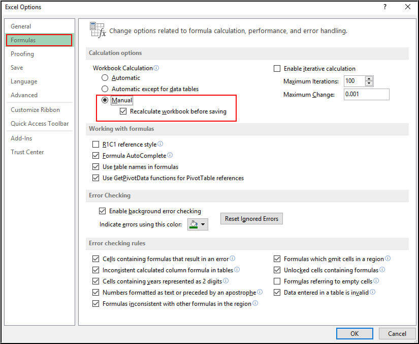 - E sob a guia “Fórmulas“> altere o cálculo no modo Manual