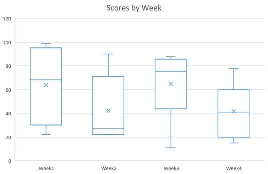 Isso pré-calcula os dados, dividindo-os nos quartis. E os dois quartis médios (2 e 3) são representados por uma caixa e os quartis acima e abaixo (1 e 4) são representados por linhas verticais chamadas bigodes, que são projetadas da parte superior e inferior da caixa.