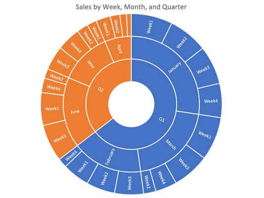 O gráfico Sunburst é um gráfico de vários níveis e exibe dados hierárquicos. Neste gráfico, o círculo interno inclui categorias de nível superior e o círculo de saída mostra subcategorias e, depois disso, o círculo é assim por diante.