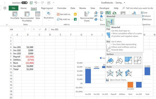 - Clique em Insert e depois em Inserir gráfico de cascata, estoque, funil, superfície ou radar.